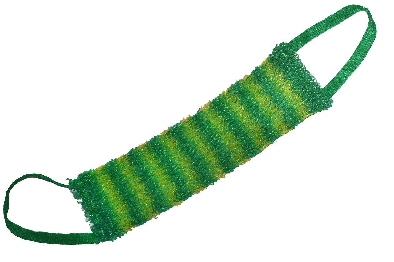 Мочалка банна "Зебра" з ручками. Мочалка банна «Зебра» для прийняття банних процедур у вигляді ременя, виготовлена з поліпропіленової нитки, створює рясні піни завдяки внутрішньому шару поролону. Прекрасно регенерує шкіру, прибираючи відмерлі клітини. Мочалка стійка до стирання, не викликає алергії та забезпечує гарний масажний ефект.